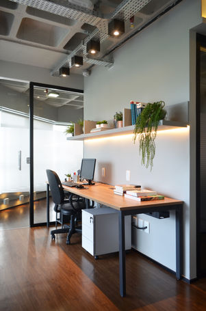 A Qualify é um escritório de TI. O projeto surgiu da necessidade dos clientes de unificarem numa sala todos os setores da empresa que estava crescendo e ocupava salas em diferentes andares. A proposta foi apostar em estrutura e instalações aparentes em um estilo industrial, fazendo um contraponto com a madeira e pontos de cor.