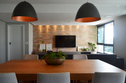 Com toques clássicos e modernos, o projeto cria uma atmosfera elegante, confortável e minimalista. A madeira e o tijolinho se unem a diferentes tons de cinza e cimento queimado, resultando em um projeto contemporâneo e aconchegante.