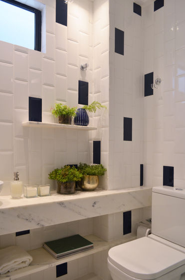 Este apartamento perto do mar ganhou cara nova com tons de madeira, branco e azul. A pedido da cliente, o sanitårio não tem armårio, em compensação, ganhou essa prateleira super charmosa e pråtica.